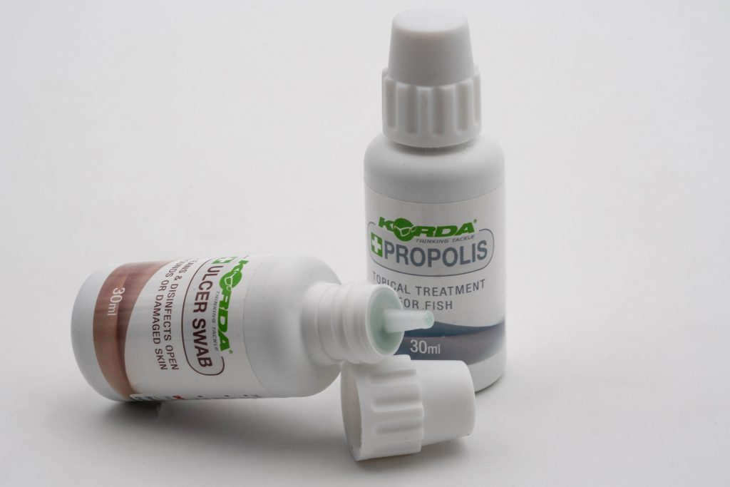 As anglers we want to return any fish that we catch in the best condition possible, and the Carp Care Kit certainly helps to achieve that. It comes in a zipped pouch and includes 30ml each of Propolis and Ulcer Swab. The Ulcer Swab is designed to clean and disinfect any wounds or ulcers on the fish, thus preventing the area from becoming infected by bacteria or fungus. Propolis, which is a naturally derived product which comes from bees and has antibiotic and antimicrobial properties, can then be applied to seal the area and preventing anything getting in to the cleaned area. When used together they give any damage the best chance of healing. The kit contains a 30ml bottle of each of Ulcer Swab and Propolis.